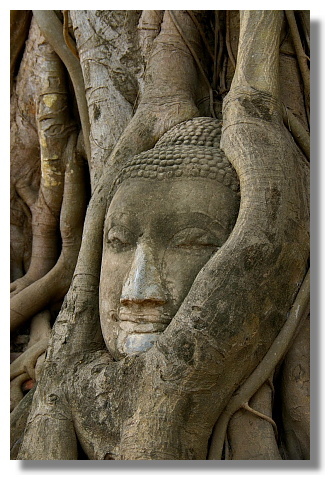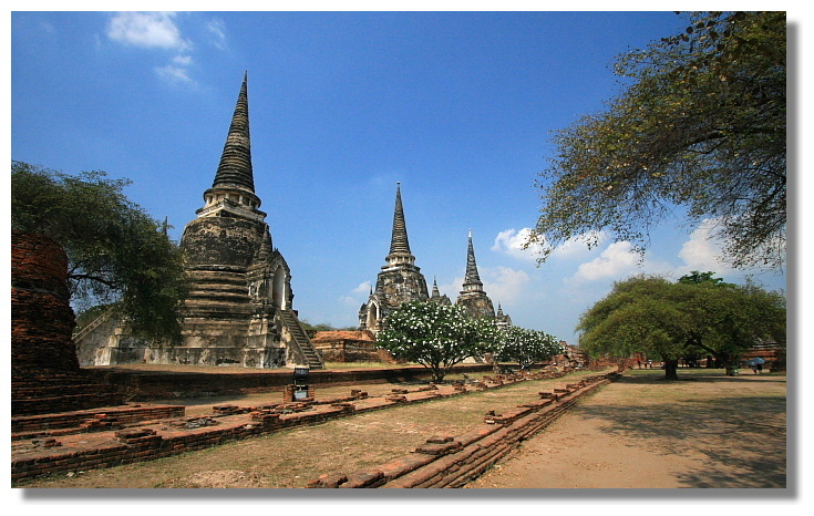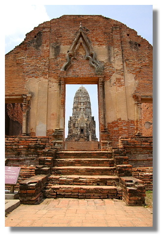 瑪哈泰寺之所以聞名最主要的原因是有那佛頭被樹幹包圍的奇景.這一直被我認定為來大城必看的景點之一.我第ㄧ次來大城居然沒看到.事後便一直耿耿於懷.(該死的一日團,居然偷工減料)終於在去年的第二次來訪時才親眼目睹他.來大城沒來看這奇景真的可以算是沒來喔.瑪哈泰寺後我來到一旁的Wat Ratchaburana.這是我第一次參觀這間佛寺.相比之下,他的保存就比瑪哈泰寺來的好.佛寺的風格融入了印度教的氣息.很值得一遊.(在這裡的入口,阿偉我看了一下這邊所賣的明信片.原本是想說看看別人是怎麼拍這邊的古蹟,但居然看到一間超美又脫俗的佛寺.便決定這次要去造訪他)接下來我走到位在古蹟區中間的Wat Phra Si Sanphet和Wihan Phra Mongkhon Bophit.這一帶是之前大城皇朝的皇宮所在地.但由於這兩間佛寺我之前都已經有參觀過了,所以新鮮感並不是很高.不過來大城卻也是必要的參觀景點.尤其是Wat Phra Si Sanphet.(必看)在這兩者附近還有個類似Wat Ratchaburana的Wat Phra Ram.但由於看起來太雷同了,這次只好暫時忍痛把他給省略了.(最主要是想要省入場費囉,窮哩.下次來再去吧;幾乎每個佛寺都要入場費,觀光財真是太好賺了)