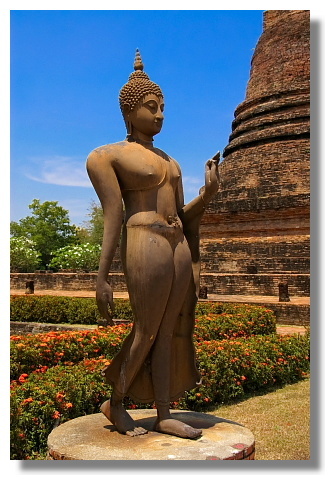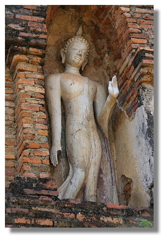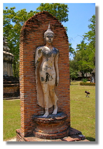 素可泰這邊還有一項與其他地方不同的特色.在曼谷與大城,你所看到的佛像形式不外乎是坐姿,站立,或是躺臥.但素可泰這邊有所謂的"行走佛".也就是佛像是塑成佛陀是在走路.這點在其他地方就不常見了.阿偉之前有看到一本書把這特色描述成是"比其他佛像更有拯救世人的力量".原因就是因為他們是"行動派"的.比起坐在那邊,或是站在那邊,又或是躺在那邊,更有說服力.這點你認為呢?待續.....