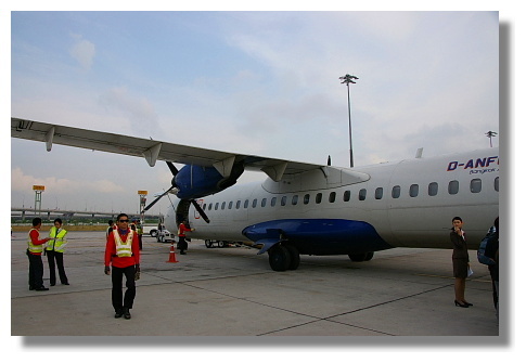 素可泰的原意是幸福的黎明.據了解,泰國的文字,藝術,文化與法規,很多都是在素可泰時期開始創立的.蘭坎亨(Ramkhamhaeng)是素可泰王朝最著名的君王.他便是第一位替泰國留下詳盡碑銘記載的人,同時他也利用高棉文,梵文,巴里文,成功的創造發明了泰國文字.如同剛剛所說的,素可泰離曼谷有4百多公里遠.如果搭車的話,費時最少要6小時以上.為了節省時間,阿偉我選擇搭乘唯一有班機從曼谷直飛素可泰的曼谷航空.(Bangkok Airways)第一次搭曼谷航空的感覺是這家公司的服務是超讚的,即使只是搭一般的經濟艙,都可以享有使用商務艙貴賓室的權利.這對一大早還沒吃早餐便趕來機場的我來說可是一個超貼心的服務.就在這邊幫他打一下廣告吧.除此之外,機艙內的餐點也是挺讚的.而素可泰機場是該航空公司所興建規劃的.因為他使用了許多環保措施,即使規模迷你,它可是得到許多國際的獎項喔.對了,另一個值得一提的經驗是這是我第一次搭螺旋槳式的飛機.之前在台灣搭國內線的班機我都會避開是用螺旋槳的航班.最主要的原因是怕它會不穩.阿偉我最怕像是搭雲霄飛車的飛機了.不過這次真的搭了螺旋槳式的飛機後讓我對它完全改觀.沒有想像中的那樣可怕.長久的誤解終於煙消雲散.