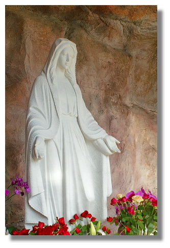 聖母朝聖地曾經有過神蹟.一旁的石碑上刻著:"五峰旗聖母朝聖地的奇異恩寵.由本朝聖地(標高168公尺)至聖母山莊(標高884公尺)步行約三小時.聖母山莊系羅東靈醫會巴瑞士修士及好友們立有十字架,聖母像及小木屋供登山者避風雨之用,他並在此修行.後來經常有人前往敬禮聖母,也得到許多大小恩典.1980年11月9日五位自強登山隊員急需下山,向聖母瑪利亞祈求保佑,夜行中歷經艱險平安到達此處,即在此上方山洞位置見到聖母顯現.為紀念此一事蹟,國內外恩人慷慨奉獻合力興建本朝聖地,以宣揚此一奇蹟於世."(原來是聖母瑪利亞在此現身解救登山客)