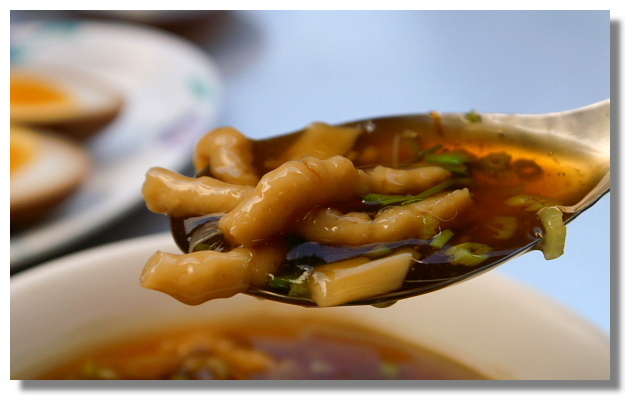 回到礁溪市區,阿偉我來到一家名為義眾小吃的店去試試它出名的魚羹.(就因為它是以魚羹出名,所以又稱為魚羹の家)第一眼看到這魚羹有點傻眼.細細長長的外型與一般圓圓胖胖的肉羹或是魷魚羹還差蠻多的.看店裡的介紹說這魚羹是用鯊魚肉和旗魚肉所製成.吃起來口感覺得軟軟的,沒什麼嚼勁.羹湯喝起來甜甜鹹鹹的.還蠻對我的胃口.不過整體來說,我個人是覺得普普啦.這裡還有賣溫泉黃金蛋.配著醬汁一起吃,倒是還蠻不錯喔.(好吃過一般的滷蛋)