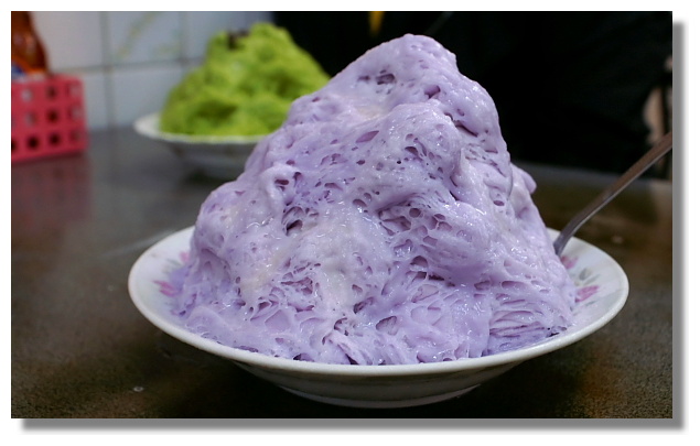 | 羅東夜市"冰雪"賣的芋頭雪花冰(後者是抹茶雪花冰) |