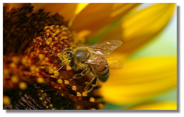 | 大大朵的向日葵卻是個例外.瞧,連蜜蜂對他也愛不釋手. |
