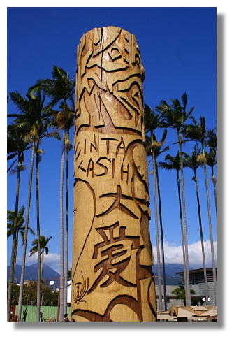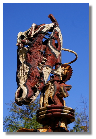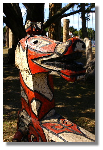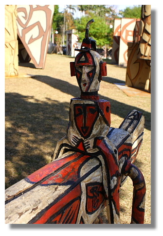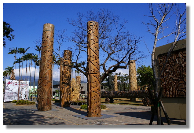 這邊的圖騰木原來是藝術家吳炫三的創作.大大小小的木雕據說最長有16公尺,重達18公噸.身在其中感覺自己好像來到加拿大的原住民部落一般.(那邊一樣也是有著許多巨大的圖騰木)不過偷偷的告訴你,我自己還是比較喜歡原味的原住民圖騰.吳大師的作品太抽象了.通俗的我如果不看介紹還真不知那些藝術品是有什麼涵義哩.相對的,那些原住民圖騰上的各種動物與人物就淺而易懂,說是比較親民應該不為過吧?在這些巨木之中,我個人最喜歡的居然是一個體積不大,名為"馬與小孩的對話"的雕塑.看介紹是說小孩與動物之間好像是可以彼此溝通的.雖然互相說著不同的語言,但是透過心靈相通的電波還是可以了解彼此.在小孩與馬的頭上各有一個類似天線的東西來呼應這個想法.我是覺得還蠻有趣的囉.
