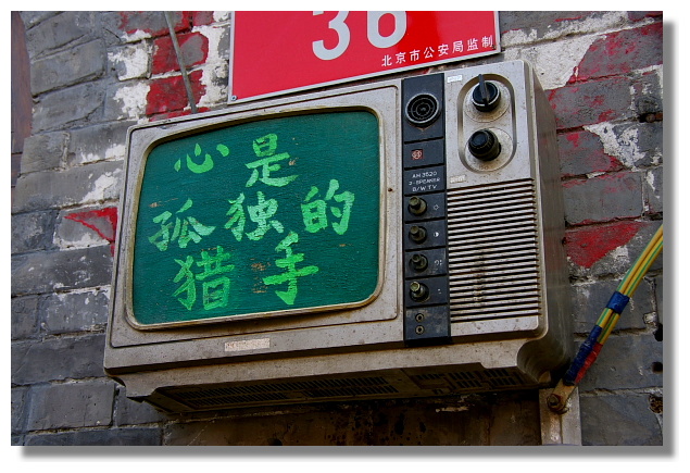 過客酒吧也是南鑼鼓巷上的名店.有點類似紅衛兵風格的店徽特別吸引著我的注意.內部的裝潢擺設也是以大紅為基調.讓人覺得蠻喜氣洋洋的.牆上貼著店主人四處旅行所拍的大海報照片.看上面寫著他有好幾次騎單車到西藏拉薩旅行的經驗....只能說真是厲害.也許就是因為愛旅行的關係所以在該店內可以看到許多相關的口號,如"以自助旅行者中來,到自助旅行者中去的路線是過客酒吧一切工作的根本路線","Better Travel than Dead","我們同沒錢旅行和沒時間旅行的思想還要進行長期的鬥爭".我覺得還真的蠻有意思的.除了酒吧與餐廳之外,它也有賣一些自己所設計的t-shirts和水壺.而上面自然很多又是印有著相同理念的口號.呵呵.這是一家非常受歡迎的酒吧.晚上來了兩次都是人山人海,生意超好.