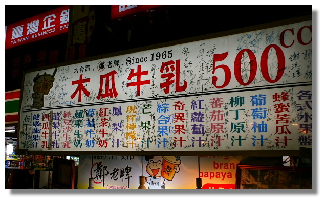 阿偉今天出差到高雄.晚上下榻位在鹽埕區的中信飯店.前不久看到一本介紹南部夜市美食的雜誌說在六合夜市裡有家賣木瓜牛奶聞名的老店.阿偉我這次就慕名而去喝看看是不是真的有那麼好喝.有了高雄捷運後,在高雄市區活動頓時變得十分的方便.六合夜市就位在美麗島站的出口附近.而這家木瓜牛奶店(正確應該說是個攤)就在入口的不遠處.招牌上有著許多名人的簽名.原來店名叫做"鄭老牌"木瓜牛奶.1965年就開始營業.除了木瓜牛奶之外,它還賣許多其他口味的牛奶與果汁.蠻多大陸來的遊客跟我一樣都是慕名而來.既然是以木瓜牛奶聞名的,我當然也就點杯木瓜牛奶來試試.跟我在台北的台北牛乳大王所喝的木瓜牛奶相比,鄭老牌的木瓜牛奶甜了許多.而且奶味與木瓜味也都比較重.再加上一杯50元的售價,對比目前台北牛乳大王的70元一杯,我個人是比較愛鄭老牌啦.六合夜市裡的東西我認同都是賣給外地來的遊客而且都沒什麼特色,但鄭老牌的木瓜牛奶我個人是蠻推薦的.好喝到我原本還想再點一杯說.不過還要吃正餐的關係就打消了念頭.