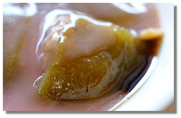 先來說說這綠茶肉圓.其實我對這綠茶肉圓還蠻有印象的.記得我在電視上某個美食節目中有看到介紹這肉圓的片段.來到了這家店的門口,即使它已經算是一間"名店"了,但它內部的裝潢卻與一般的小吃店沒什麼兩樣,走的是低調平實風.這裡所賣的綠茶肉圓跟彰化的肉圓一樣,都是用油炸的.(浸在溫油裡)至於吃起來的味道如何?嗯,個人我是覺得普普耶.這淡墨綠色的外皮就是添加了綠茶粉,但綠茶的味道並不是很濃.與我想像中的有蠻大的落差.老實說有點失望.
