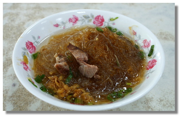 阿偉今天跑到高雄出差.踏出了高鐵車站,轉入了高雄捷運,就在等捷運來時,頭頂上的電視撥出了美食介紹的節目.節目中所介紹的店家叫冬粉王,它位在高雄的鹽埕區.既然有節目推薦,那我就親身過去一趟試吃看看吧.顧名思義,冬粉王這家店主要是在賣冬粉相關的小吃.冬粉中可以選擇搭配豬肉,豬肝,豬心,豬肚等等之類的內臟或是改加鴨肉也可以.但就是因為節目中有許多的食客都說這裡最必點的小吃是乾冬粉,阿偉我就捨配料豐富的選擇而點了碗簡單的乾冬粉囉.由於我來到這家店時,剛好是中午用餐的時間,店裡滿滿的都是人.坐在我ㄧ旁的陌生人(人多到有位子就要快快坐下)跟他的朋友說這家店的生意超好,而且晚上還很準時打烊.等了一會我的乾冬粉終於上桌了.雖說是乾冬粉,但冬粉上還是有兩塊肉啦.(呵,真感動)吃起來的味道....疑,真的還蠻不錯的喔.(有點重口味就是了)推薦給大家.喔對了,這家店宣稱只要來者年過80,東西都免費招待喔!(等到80歲?!那我還真的有得等哩.不過店家敬老的心還是值得稱讚的)