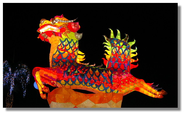 | 在主燈兩旁各有一個副燈.這是"麒麟獻瑞".另一個是一條龍(取名為"龍戲虎祈福燈") |