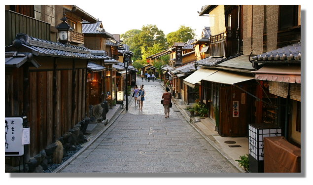 至於清水寺外的三年坂與二年坂,(所謂的坂就是坡的意思)這裡幾乎清一色都是賣紀念品給觀光客的小店.而所賣的東西幾乎都很有日本風又或是很卡哇伊.對我來說這裡可是會讓荷包大出血的恐怖地點.(但我又超愛來這)三年坂又稱產寧坂.據說它原先是通往祈求平安生產的清水寺子安塔/泰產寺的參道.因為"三年"與"產寧"在日語發音上相近的關係,所以久而久之,兩個名稱就互通了.另外,傳說如果在三年坂上不小心跌倒的話,那三年內準備入土為安吧.好家在的是如果真的跌倒的話,只要買個葫蘆就可以消災解厄.而在這裡,真的有家店的店內掛滿了各式各樣,大小不一的葫蘆.(據說這是某位高僧的指示.納悶的是為什麼是葫蘆而不是其他的東西?)我相信我下次再來京都時,一定還會再來這晃的.