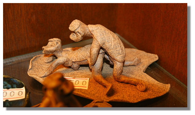 | 上圖:充滿傳統氣息的二年坂(二年坂與三年坂上幾乎都是兜售遊客記念品的店家) 下圖:我在三年坂的某間店裡發現這個限制級的陶瓷作品(18歲以下請勿觀看.呵) |
