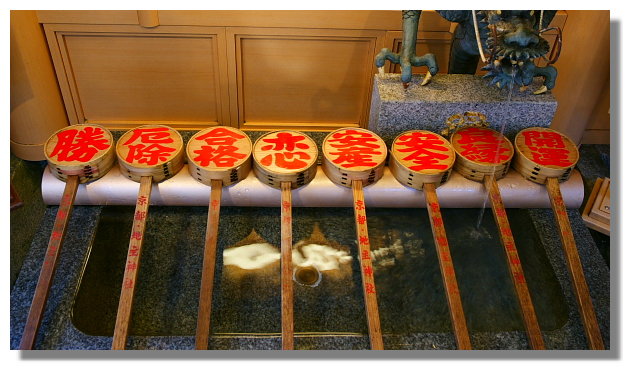 這次再訪京都,不免俗的我又來到了名列世界文化遺產的清水寺.之所以會來到這,除了因為同行的友人沒去過之外,清水寺一旁的三年坂與二年坂可是我最愛的京都"購物區".(這所謂的三年坂與二年坂已經被我認定為來京都必遊的景點)清水寺的本堂內所供奉的主神是一尊11面千手觀音.本堂前方有個向外延伸的空間被稱作是舞台.它建於懸崖邊,由139根大木頭所支撐著.在這舞台上可以遠眺京都的市景.清水寺的下方有個音羽瀑布.因佛寺所在的山被稱為音羽山而得名.說是瀑布,個人我覺得其實它只是個"非常人工化"的山泉水流出口罷了.由左而右共有三道泉水流出,分別為"學問成就之水","戀愛成就之水",與"延命長壽之水".喝這泉水還蠻有學問的.可不能亂喝喔.這三道泉水一次只能選一種來喝.而且每次只能給它喝一口而已.據說如果一次喝了多過一種,那願望就不會實現.如果喝了多過一口,那願望的達成率就會降低.(喝兩口達成率降為二分之一.喝三口達成率降到三分之一)所以貪心的人來這喝水可要多留意了.呵.(只是怎麼想我都覺得這條文只是用來防止大家都擠在泉水口慢慢喝而賴著不走,最後導致大排長龍....你認為呢?)