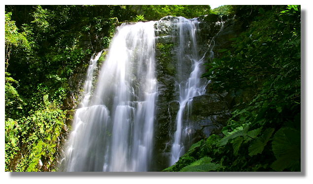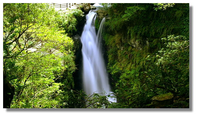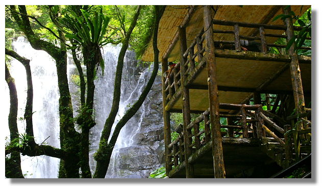 | 處女瀑布位在蚋仔溪的支流上.這個瀑布的一旁有個兩層式的觀瀑亭.也許是因為颱風剛過的關 係,瀑布的水量還蠻多的.即使不是身處於瀑布的正前方,但四周的水氣充沛,感覺好像在下雨似的 |