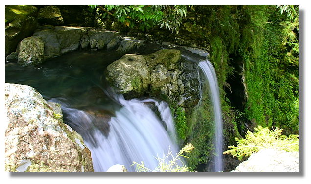 | 滿月圓瀑布的下方有座滿月小橋.但因為瀑布旁的岩壁阻礙視線的關係,在橋上反而看不到瀑布 的全貌.橋下的水潭中有許多的魚類悠游其中.個人我覺得這裡比較適合賞魚而非賞瀑的好去處 |