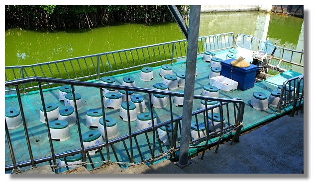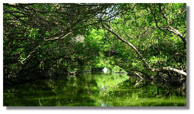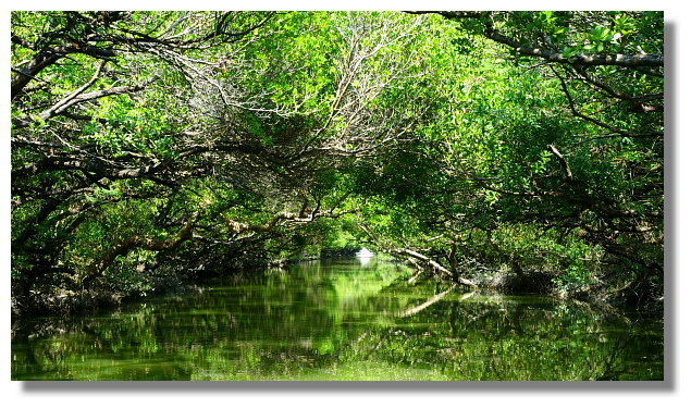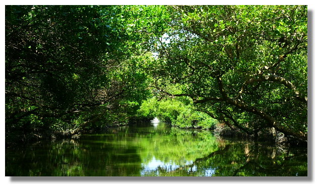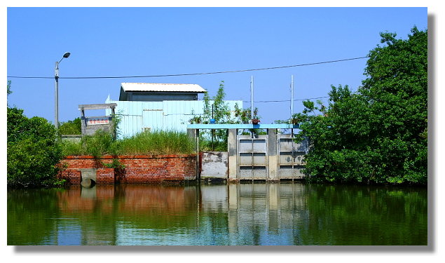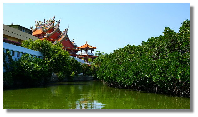 大眾廟旁的碼頭提供兩種水上行程.一個號稱是台江航線.另一個則是綠色隧道航線.看業者所提供的資訊,台江航線是採用所謂的觀光船航行.來回一趟需花費大約70分鐘的時間.船票則是全票一張200元.而綠色隧道航線則是採用竹筏航行.來回一趟大約只要30分鐘的時間.全票一張要價150元.(兩者相比之下,感覺台江航線比較划算.但因為最想看的是綠色隧道,我也只好捨台江就綠隧了.心想等我以後有更多的時間,我再來試試這台江航線好了)這所謂的紅樹林水上綠色隧道就位於四草大眾廟後方的不遠處.河道的兩旁長著茂密的紅樹林植物.竹筏航行於樹木所形成的天然隧道下感覺還真的挺不一樣的說.這一趟綠隧行算是有值回票價囉.(個人我是蠻喜歡隧道中那種幽靜與綠意盎然的感覺.很讚)
