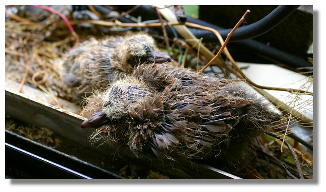| 這兩隻幼鳥窩在一起感覺還真的很像兩陀麻糬說.還蠻有趣可愛的.不知斑鳩媽媽是跑去 哪邊覓食了.好奇牠是餵這兩隻幼鳥吃什麼東西(蟲蟲嗎?)右邊這隻幼鳥比左邊的還大隻 |