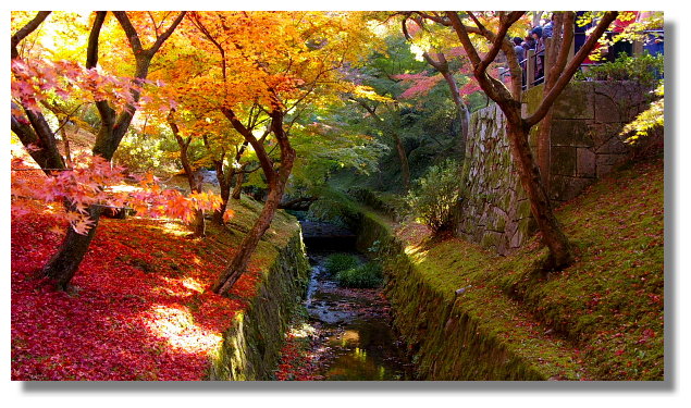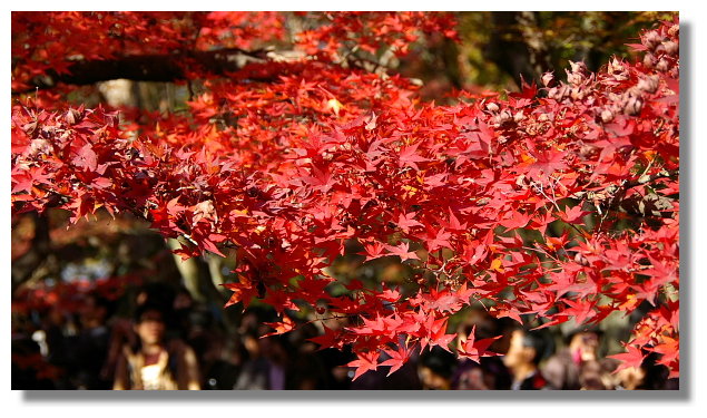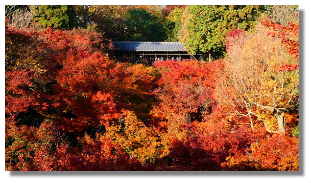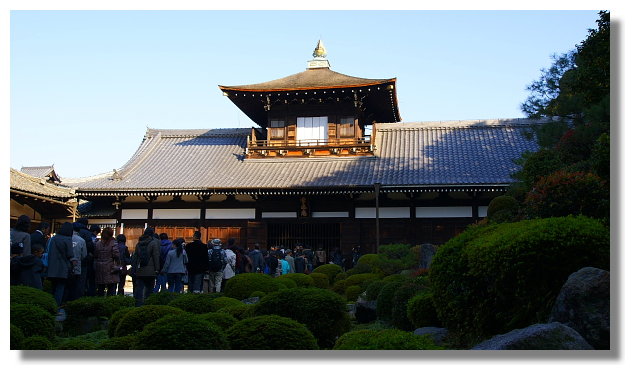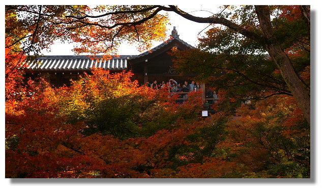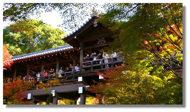 走到寺院的入口之前,我經過了一條橋取名為臥雲橋.由橋上往一旁望去,橋下的溪谷整個都是紅黃又帶些綠的楓樹,五顏六色的看起來真的是美呆了.而溪谷上方有另一座橋叫通天橋.這座橋上同樣也擠滿了賞楓的民眾.而來到東福寺內,許多人就是想要在這通天橋上一睹這溪谷的楓紅.(通天橋的位置比臥雲橋還要來的高.賞楓的角度應該會比較好)看到這樣的美景,說什麼也想趕快走到通天橋上一起人擠人呀.呵.不過光是排隊買票進入通天橋又花了一小段時間.殘念.