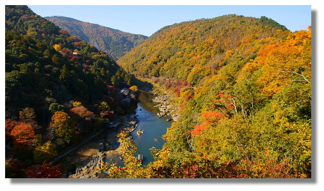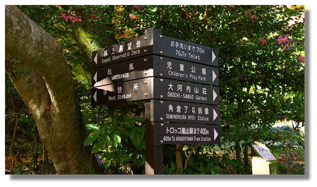 | 嵐山公園看介紹說分成三個地區:龜山,臨川寺,還有中之島.這 次我所參觀的是龜山地區.山上的展望台可以欣賞到美麗的嵐峽 |