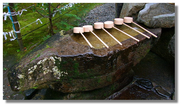 | 這黑色的鳥居據說還是日本最古老的木造鳥居樣式喔!神社內洗手的水盤也很與眾不同 |