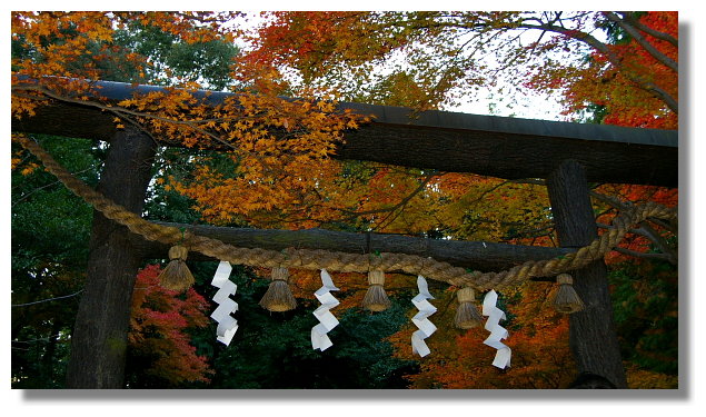 | 有別於一般日本常見的紅色/原木色的鳥居,野宮神社的鳥居是帶著樹皮的黑色鳥居 |