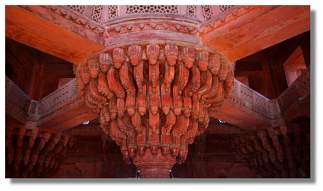 | 這是私人大廳(Diwan-i-Khas)內的石柱雕刻.上方有四座石橋通往四方.據說這裡是阿 克巴大帝接見官員與學者之地(阿克巴大帝坐位正中央.而其他人則分散於石橋的尾端) |
