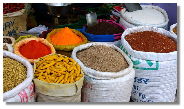 | 市集內賣著各種顏色的香料(不知是不是因為很多印度人都吃素,這裡比較少見到賣肉的攤子) |