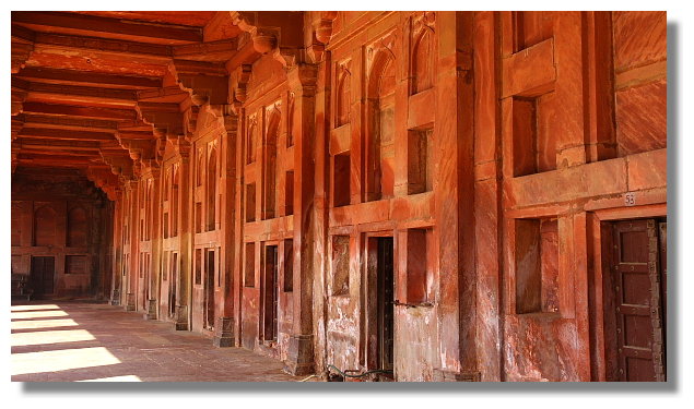 | 清真寺(Jama Masjid)內的迴廊.這座清真寺融合了波斯與印度的建築風格 |