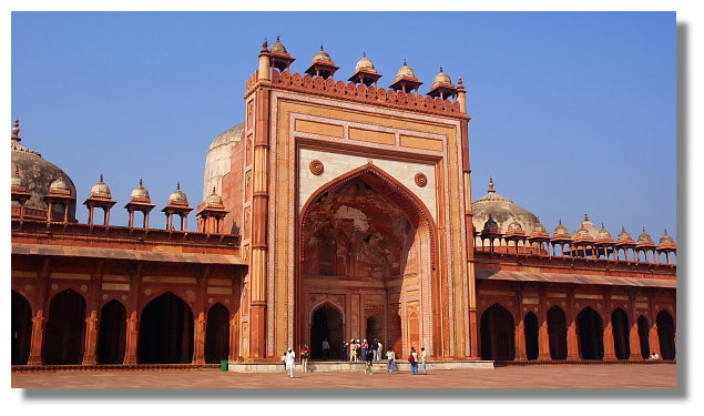 | 法特普希克里遺蹟內的清真寺.這座清真寺前的廣場十分的寬廣.而回教聖人的陵墓也在其 中.清真寺有個大門叫布蘭德達瓦喳(Buland Darwaza).這個門高54公尺.象徵勝利之門 |