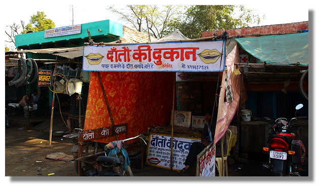| 法特普希克里巴士站的一旁就是當地的市集.(有個鐘樓)我很好奇這是不是當地的牙醫?如 果是,這衛生條件會不會也太...(是你你敢在這裡拔牙嗎?顧店的人看起來也不像是專業人士) |