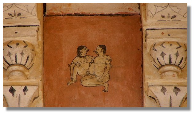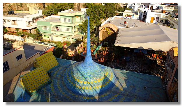走在這棟旅館裡,到處都看的到許多當地的藝術品.無論是雕刻或是繪畫,又或是其他的裝飾品,它所給人的感覺就是與一般的廉價旅館不同.雖然昨晚我所睡的房間裡連個獨立衛浴也沒有,但住起來卻也覺得蠻舒適的.我想就是因為這裡的氣氛造就了這樣的感覺吧?雖然昨晚我所睡的房間很精簡,但另外兩個女生可是睡這裡的高級房間喔.(空間大,有衛浴,還有陽台哩.當然她們就得付更高的住宿費囉)其實在出發去印度前,我們有試著用網路跟這家旅館訂房.但所得到的回覆居然是已經客滿.沒想到親身來到此後,居然還會有空房,這實在是讓我們感到十分的意外.也因此即使所剩的也只有一間高級房與一間精簡房,我們都決定給它住下.昨晚我在辦入住手續時,還有很多人來問是否有空房哩.由此可見這家旅館是多麼的受到背包客的青睞.值得一提的是這裡的頂樓是一間餐廳.在那有個以孔雀為造型的大型裝飾品喔!