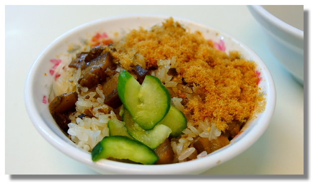 這家店的內部裝潢走的是簡單的平民風.而來這的食客大部分也都是點米糕與四神湯這兩樣東西.店內的工作人員看見我手拿著相機便親切的問我說我是從哪裡來的.雖然只是個簡單的問候,卻給我很溫馨的感覺.(這就是所謂南部人的熱情吧?)不一會兒,我所點的米糕與四神湯就上桌了.這米糕並不大碗,兩三口就可以被我給解決乾淨.米飯上淋上了肉燥,並加了一些魚鬆與小黃瓜.整體吃起來還不錯,但因為份量少的關係吧,吃完後我總是覺得有那種很沒有滿足感的感覺.(阿偉我特別喜愛那種便宜好吃又大碗的東西)我想這大概就是為什麼我對米糕並不是很感興趣的原因吧?(印象中米糕都是小小的一碗)至於這四神湯喝起來清爽又順口,湯頭沒有很重的中藥味或酒味.個人我覺得很搭這裡的米糕喔!