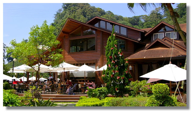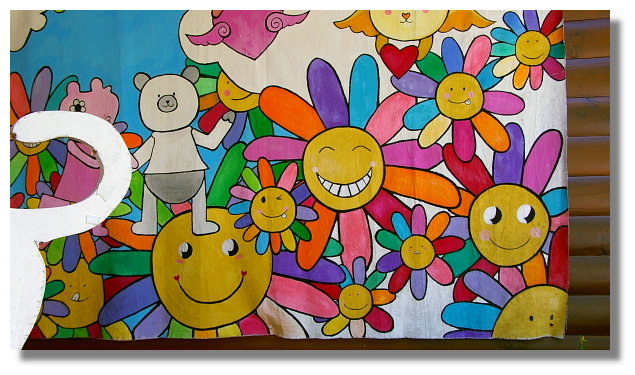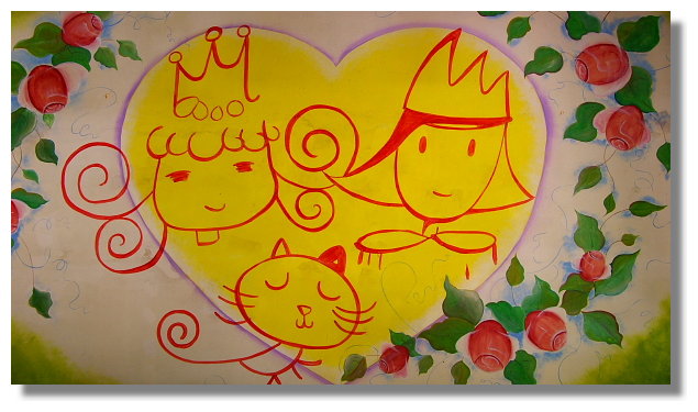 這裡的餐廳是整個園區內最醒目,也是最大的建築物.而它則是號稱為"滿足幸福".牆壁上 的這幅公主與王子的愛情圖畫讓人感覺好像身處於甜蜜美滿的國度內(需要一些想像力) |