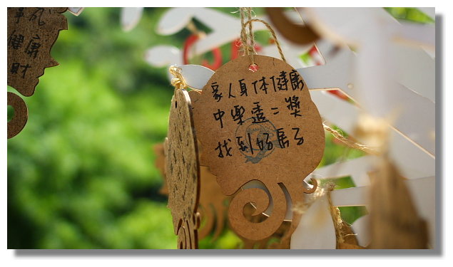 店家還在花園裡放了一個可以掛上許願卡的人工造型樹.瞧寫這張卡片的人居然只求中樂透二 獎.看來他應該是個不貪心的人(還是他現在就已經錢多多了.不然怎麼會求要找到好房子呢?) |