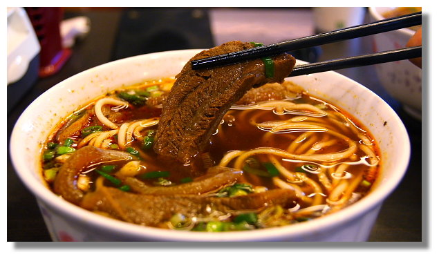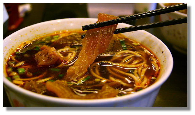 一開始因為湯給的有點多,我便把一些湯給喝掉,這樣麵內的牛肉塊與牛筋才能完整的顯現出來(湯 可以再加.而這碗麵的湯頭個人覺得也很不錯.雖然有些微的油膩,但香辣夠味.如果能再濃稠些會更好) |