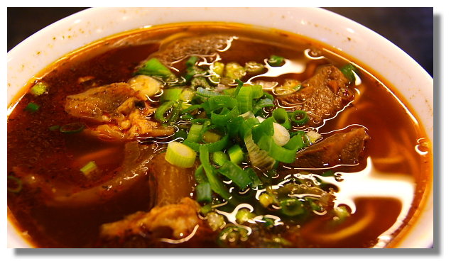 這裡的牛肉麵有分三種口味:清燉牛肉麵,蕃茄牛肉麵與辣味牛肉麵.(這所謂的辣味就是我們一般所 稱的紅燒)聽我同事說這家的紅燒(即辣味牛肉麵)比較好吃.我於是點了碗大碗的辣味筋肉麵來嚐嚐 |