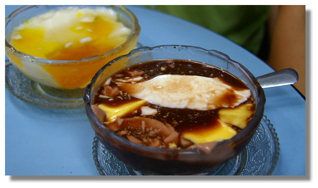 | 看的出這三色布丁豆花有哪三種顏色嗎?有白色(鮮奶),黃色(雞蛋)與咖啡色(可可亞).而這甜品所用 的糖水是用可可亞所製成.這點倒是比較不一樣.不過這三色布丁豆花吃起來個人我覺得味道與口感 並沒有什麼令人驚喜之處.也因此我只給它普通的評價(個人我倒是很好奇這應該算是豆花還是布丁?) |