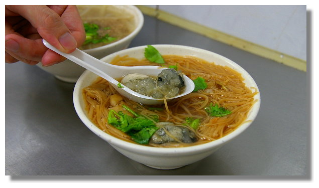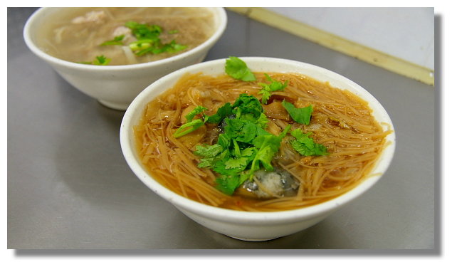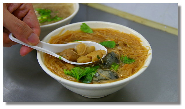 | 這家店所賣的蚵仔麵線與一般的麵線比較不一樣的地方在於它是用清湯而不勾芡.看牆上所貼的介 紹是說這樣會少了一般麵線的黏稠,也比較能吃出麵線的Q軟口感與清爽的湯底.麵線所採用的蚵仔 號稱都是新鮮不隔夜.而大腸則是經過多次的洗過再滷,滷過再洗的程序後才能確保乾淨衛生無異味 |