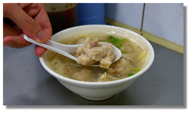 | 至於我朋友所點的這碗肉羹,我喝了一口湯與吃了一塊肉.這湯喝起來也偏清甜,而肉羹則 是用肉條裹上魚漿所製成.(非單純用絞肉製造)吃完後口中會帶有一絲魚的味道.我與友人 也都一致認為這肉羹湯好吃!也是很推薦喔(如果你覺得售價可以接受,那可以來這試試味道) |