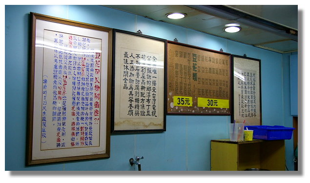 | 接下來我與友人來到一家取名為鄉淳布丁豆花的店家品嚐它的甜品.這家店的店員不曉得是 因為今晚太忙還是什麼的...感覺服務態度上有點...ooxx.看旅遊書上寫著這家的招牌三色布 丁豆花十分的被推薦,我於是點了一碗($35元)來試試看(我朋友則是點鳳梨豆花,一碗$30元) |