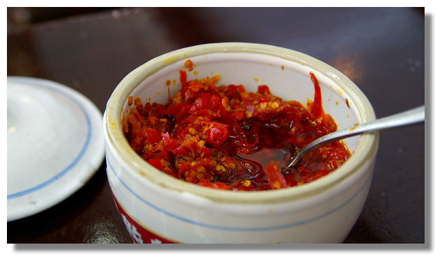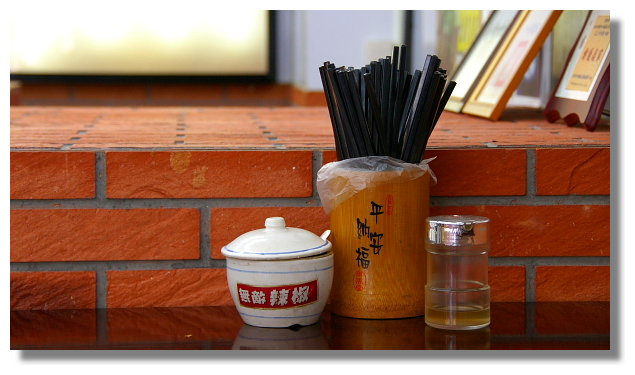 | 每個餐桌上都擺放了這三樣東西:筷子,醋,"無敵辣椒"(這"無敵辣椒"倒是很能吸引到我的注意力) |