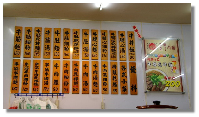這家店所賣的餐點其實還蠻多樣的.而且這裡的牛肉麵一碗只要$90元!這價格算是挺大眾化的(跟櫃 檯拿了一張名片才發現原來這家店共有四間店:士林店,和平店,長安店,大安店.我今天是光顧和平店) |
