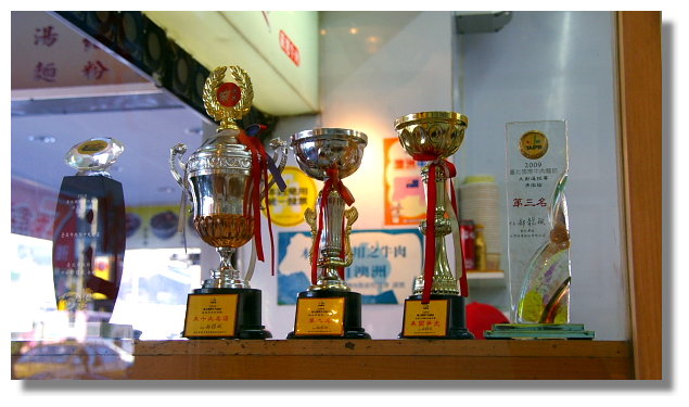 店內廚房的一旁放置著這家店所得獎的獎盃與獎座(它於2009年台北國際牛肉麵節的比賽中,在 清燉組獲得季軍,在紅燒組則得到佳作.所以它也算是一家"既能煮清燉,也能煮紅燒"的"強店"了) |