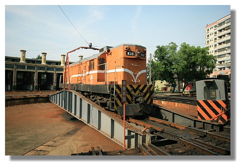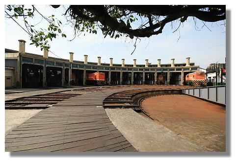 扇型車庫號稱"五星級的火車頭旅館".它的位置還蠻靠近火車站的.走路只要差不多10分鐘而已.由於該車庫看起來像是一把展開的扇子,因此得名囉.早期因為火車頭迴轉無法利用大空間的方式,便採用360度的方法,先將火車頭運行在旋轉盤上,再利用旋轉的方式將火車頭轉向任何方位.目前全台也只有彰化還存有這種扇型車庫.鐵路迷應該會很喜歡這個地方.在這阿偉還遇到一個攝影同好.長的還蠻不錯的....嘿嘿.