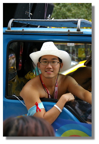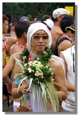 來到了集合區,最醒目的隊伍依舊又是那群所謂的"水男孩".唉...."脫",還是最能吸引目光的題材.呵呵.我是很佩服這群水男孩他們的勇氣啦.畢竟只穿著泳褲在車水馬龍的忠孝東路上行走,真的不是一件簡單的事.殺了我,我也不敢做.水男孩中有一個人讓我眼睛為之一亮.不過據我朋友說,他已經有人囉.只能說是殘念嗎?這次遊行的"噱頭"是萬人拼湊出代表同志精神的彩虹旗.主辦單位用6種屬於彩虹旗顏色的DM,分給6區的遊行隊伍.隊伍走到差不多是忠孝東路與光復南路的交叉路口時,大夥將手上的DM一起舉到頭上.由上空往下一看就是一張巨大的彩虹旗.感覺還蠻有創意的點子.事後看空拍的照片,的確是蠻壯觀的.能說在當時刻下,同志佔領了忠孝東路嗎?至少當時那路段同志絕對是多數的.